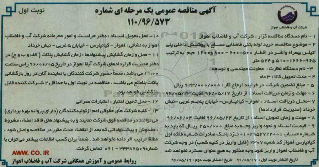 مناقصه خرید لوله بتنی فاضلابی مسلح, آگهی مناقصه عمومی یک مرحله ای ، مناقصه خرید لوله بتنی فاضلابی مسلح
