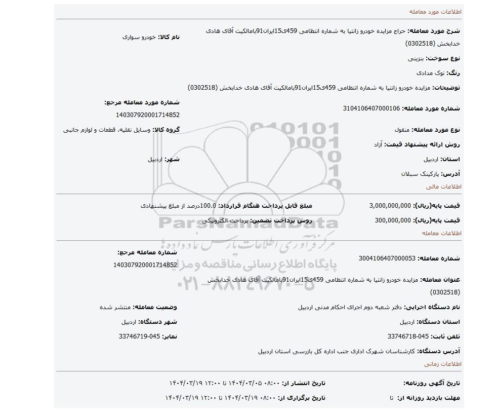 شرح مورد معامله: حراج مزایده خودرو زانتیا به شماره انتظامی 459ی15ایران91بامالکیت آقای هادی خدابخش (0302518) | نام کالا: خودرو سواری | |