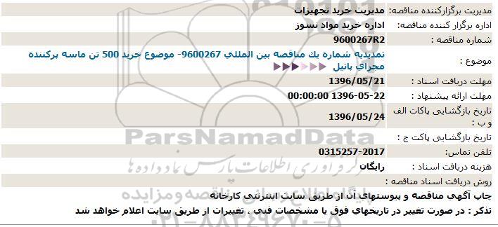 تمدید مناقصه بین المللی خرید 500 تن ماسه پرکننده مجرای پاتیل از کلیه افراد متخصص و شرکت‌ها واجد شرایط دعوت به عمل می‌آید در مناقصه با کد خبرگزاری پارس نماد: 908308 شرکت نمایند. این مناقصه در تاریخ 1396/05/17 شروع و مهلت آن تا تاریخ 1396/05/21 میباشد.