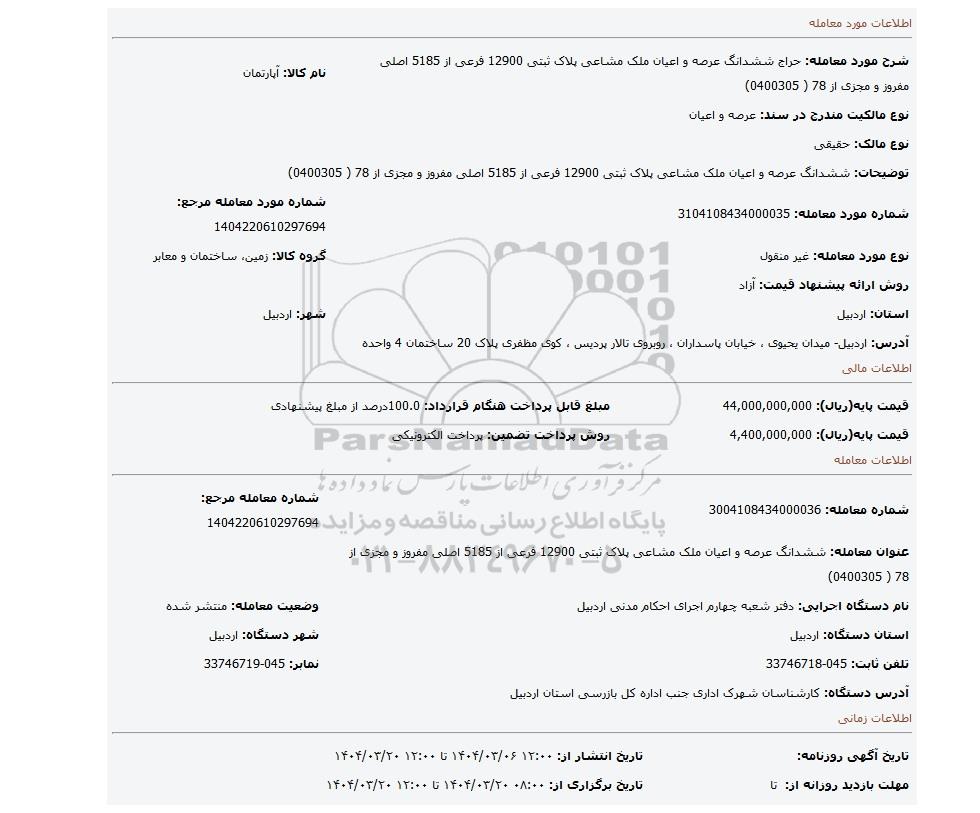 شرح مورد معامله: حراج ششدانگ عرصه و اعیان ملک مشاعی پلاک ثبتی 12900 فرعی از 5185 اصلی مفروز و مجزی از 78 ( 0400305) | نام کالا: آپارتمان | |