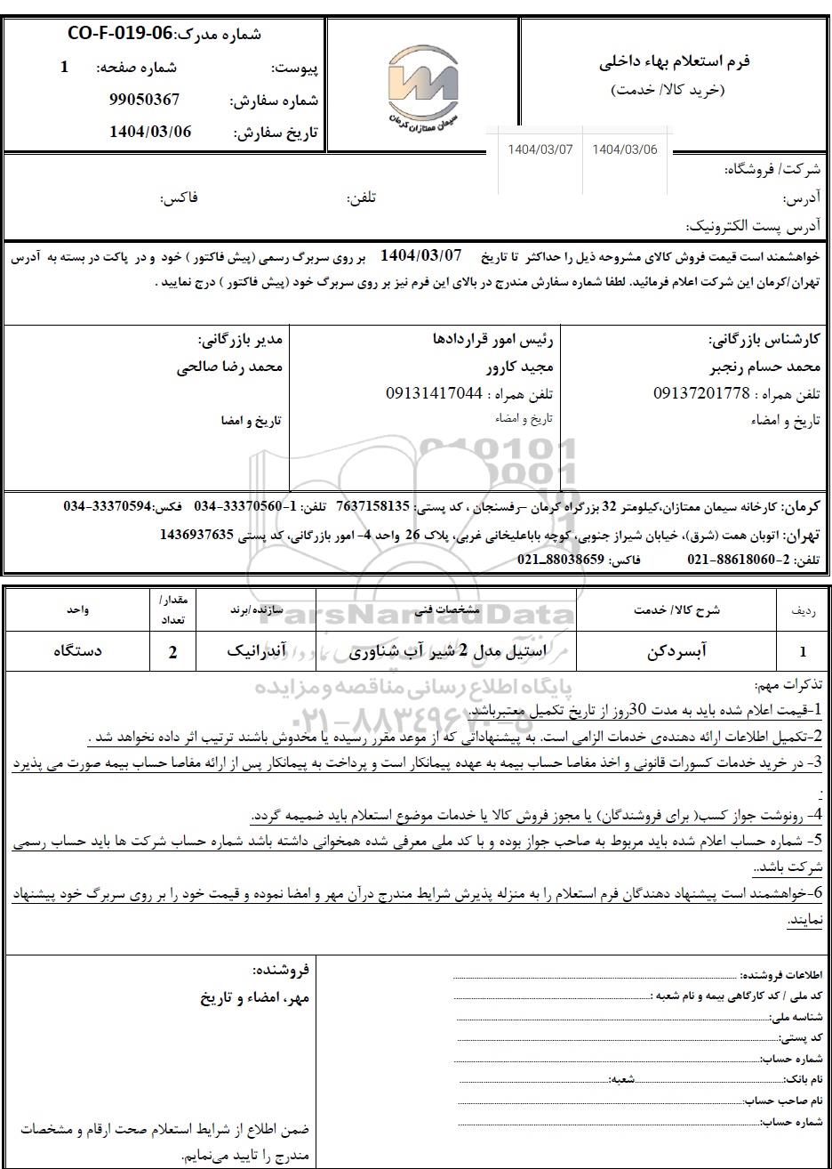خواهشمند است قیمت فروش کالای مشروحه ذیل را حداکثر تا تاریخ 1404.03.07 بر روی سربرگ رسمی (پیش فاکتور) خود و در پاکت در بسته به آدرس تهران / کرمان این شرکت اعلام فرمائید.لطفا شماره سفارش مندرج در بالای این فرم نیز بر روی سربرگ خود پیش فاکتور درج نمایید