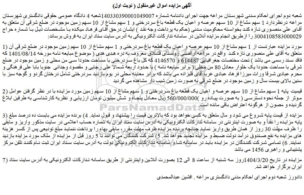 شعبه دوم اجرای احکام مدنی شهرستان مراغه جهت اجرای دادنامه شماره 140330390001049007شعبه 4 دادگاه عمومی حقوقی دادگستری شهرستان مراغه درنظردارد 1 سهم مشاع از 10 سهم عرصه و اعیان یک قطعه باغ سردرختی و 1 سهم مشاع از 10 سهم زمین موجود در ضلع شرقی آن متعلق به آقای علی منصوری تازه کند بخواسته محکومیت مدنی (حکم به پرداخت وجه نقد ) ایشان درحق آقای فرهاد میکده با مشخصات ذیل با شماره حراج 3004108583000029 را ازطریق انجام مزایده آنلاین در سامانه تدارکات الکترونیکی به آدرس سایت ستاد ایران به فروش برساند: