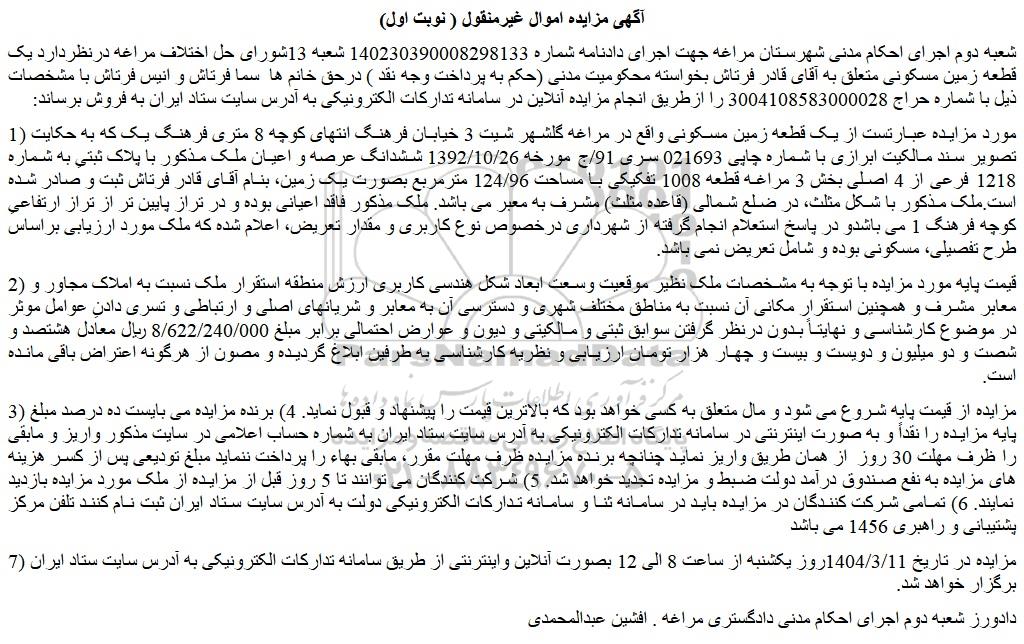 شعبه دوم اجرای احکام مدنی شهرستان مراغه جهت اجرای دادنامه شماره 140230390008298133 شعبه 13شورای حل اختلاف مراغه درنظردارد یک قطعه زمین مسکونی متعلق به آقای قادر فرتاش بخواسته محکومیت مدنی (حکم به پرداخت وجه نقد ) درحق خانم ها سما فرتاش و انیس فرتاش با مشخصات ذیل با شماره حراج 3004108583000028 را ازطریق انجام مزایده آنلاین در سامانه تدارکات الکترونیکی به آدرس سایت ستاد ایران به فروش برساند: