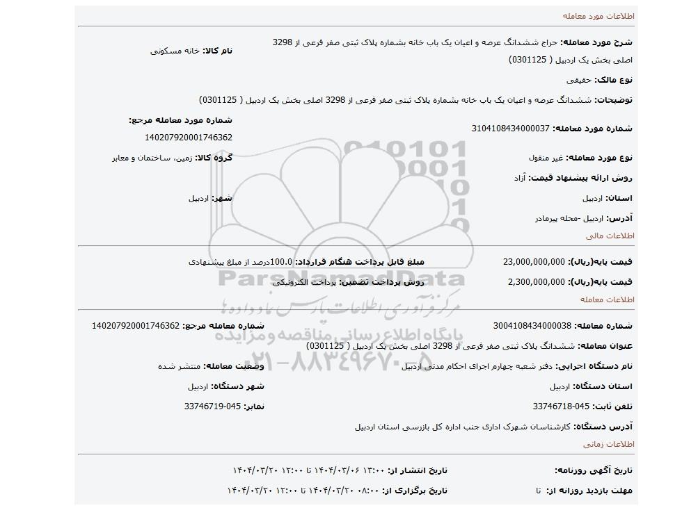 عنوان معامله: ششدانگ پلاک ثبتی صفر فرعی از 3298 اصلی بخش یک اردبیل ( 0301125) | ||