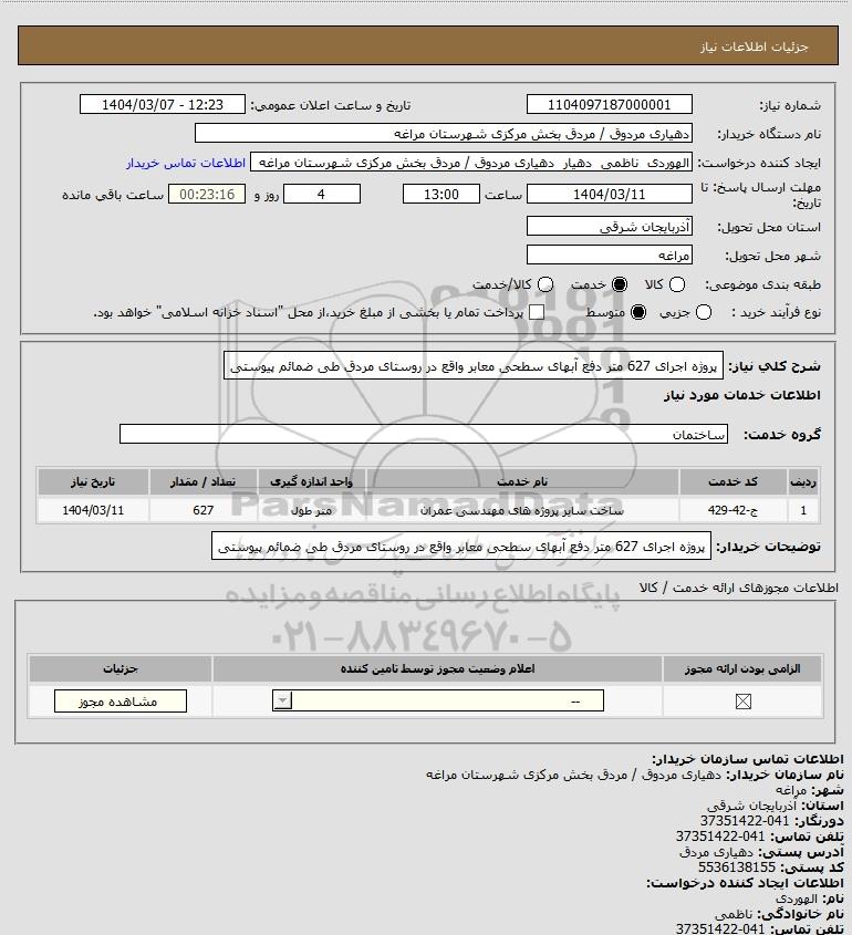 شرح کلی نیاز: پروژه اجرای 627 متر دفع آبهای سطحی معابر واقع در روستای مردق طی ضمائم پیوستی