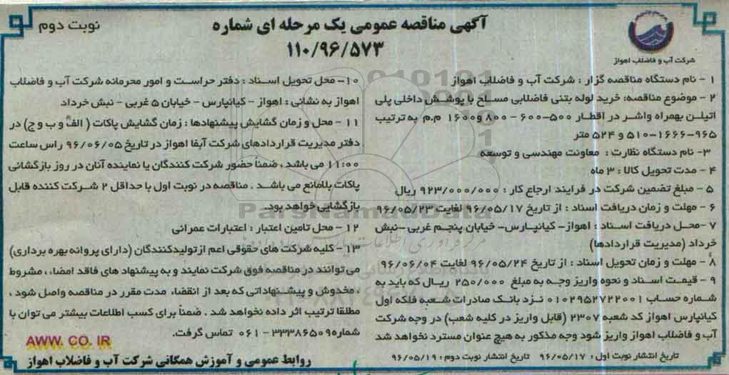 آگهی مناقصه عمومی یک مرحله ای شماره 110/96/573نوبت دوم ؟