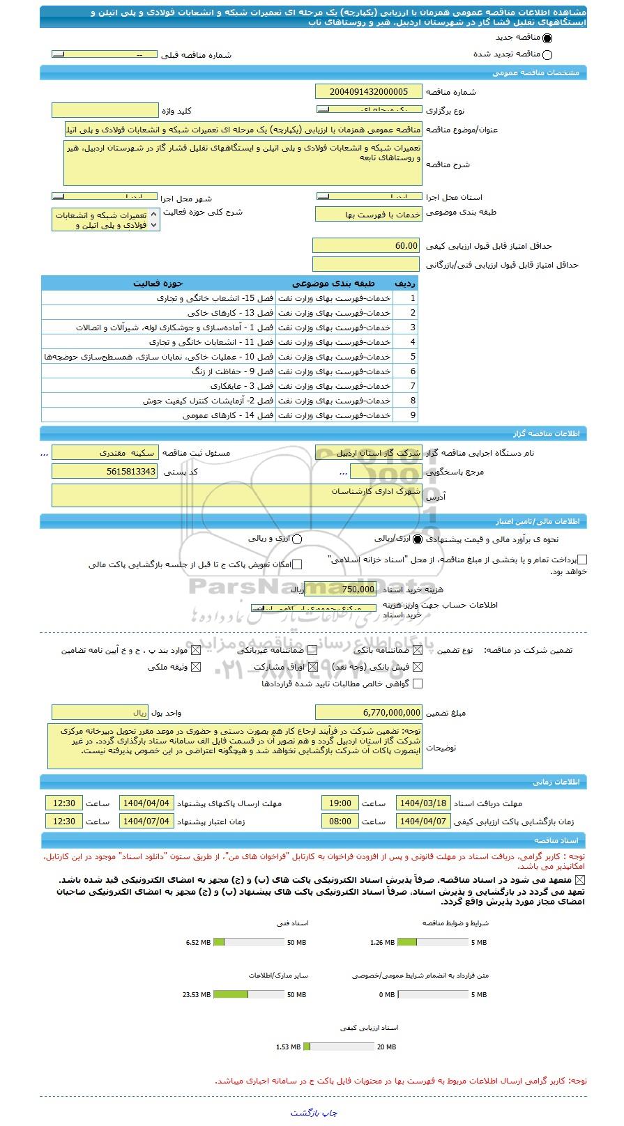 این مناقصه در استان اردبیل با دسته بندی های صنفی و تخصصی پیمانکاری نفت و گاز و پتروشیمی برگزار میشود.