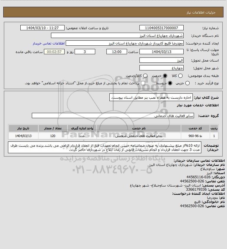 شرح کلی نیاز: اجاره داربست به همراه نصب بنر مطابق اسناد پیوست.