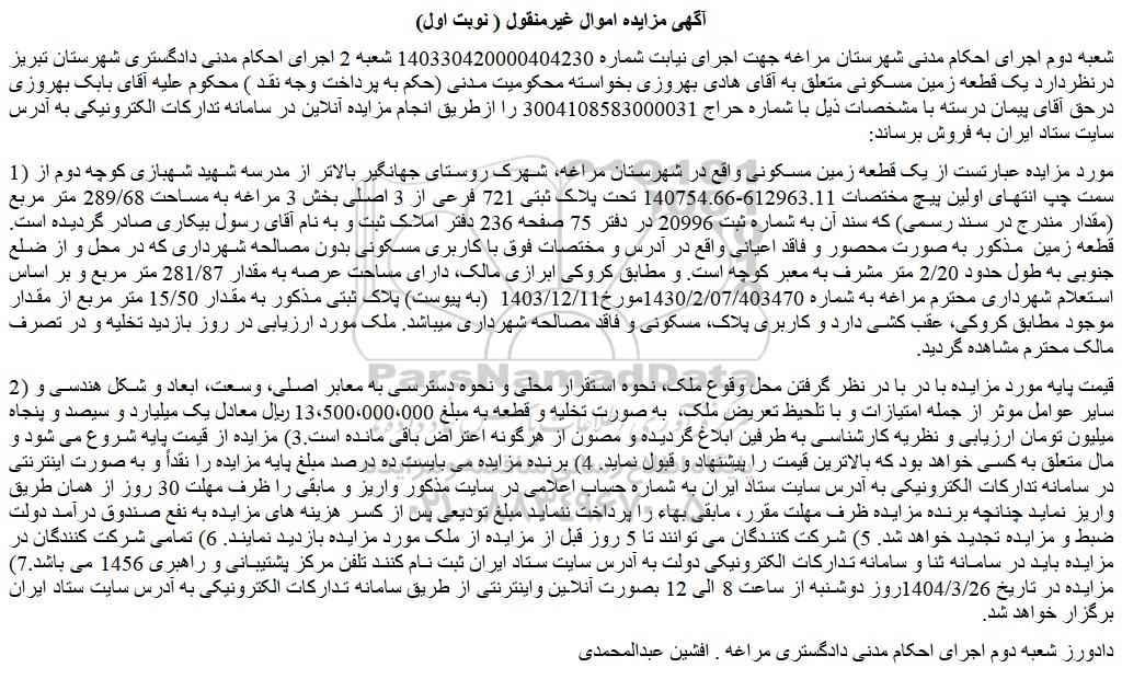 شعبه دوم اجرای احکام مدنی شهرستان مراغه جهت اجرای نیابت شماره 140330420000404230 شعبه 2 اجرای احکام مدنی دادگستری شهرستان تبریز درنظردارد یک قطعه زمین مسکونی متعلق به آقای هادی بهروزی بخواسته محکومیت مدنی (حکم به پرداخت وجه نقد ) محکوم علیه آقای بابک بهروزی درحق آقای پیمان درسته با مشخصات ذیل با شماره حراج 3004108583000031 را ازطریق انجام مزایده آنلاین در سامانه تدارکات الکترونیکی به آدرس سایت ستاد ایران به فروش برساند: