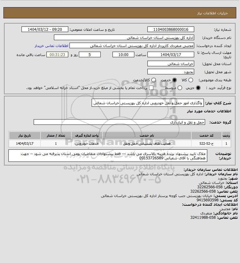شرح کلی نیاز: واگذاری امور حمل و نقل خودرویی اداره کل بهزیستی خراسان شمالی