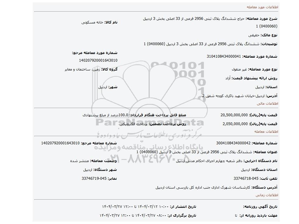 مزایده ششدانگ پلاک ثبتی 2956 فرعی از 33 اصلی بخش 3 اردبیل (0400060) 1, مزایده، ششدانگ پلاک ثبتی 2956 فرعی از 33 اصلی بخش 3 اردبیل (0400060) 1