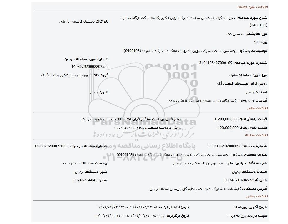 مزایده باسکول پنجاه تنی ساخت شرکت توزین الکترونیک مالک کشتارگاه سامیان (0400103), مزایده، باسکول پنجاه تنی ساخت شرکت توزین الکترونیک مالک کشتارگاه سامیان (0400103)