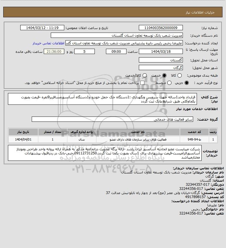 نام دستگاه خریدار:مدیریت شعب بانک توسعه تعاون استان گلستان