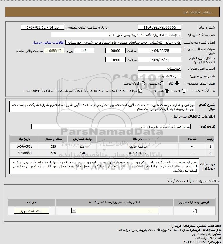 شرح کلی نیاز: پیراهن و شلوار حراست طبق مشخصات دقیق استعلام پیوست/پس از مطالعه دقیق شرح استعلام و شرایط شرکت در استعلام پیوستی،پیشنهاد قیمت خود را ثبت نمائید