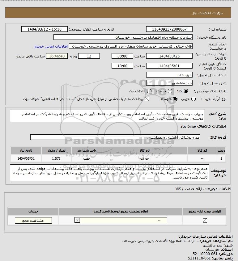 شرح کلی نیاز: جوراب حراست طبق مشخصات دقیق استعلام پیوست/پس از مطالعه دقیق شرح استعلام و شرایط شرکت در استعلام پیوستی، پیشنهاد قیمت خود را ثبت نمائید