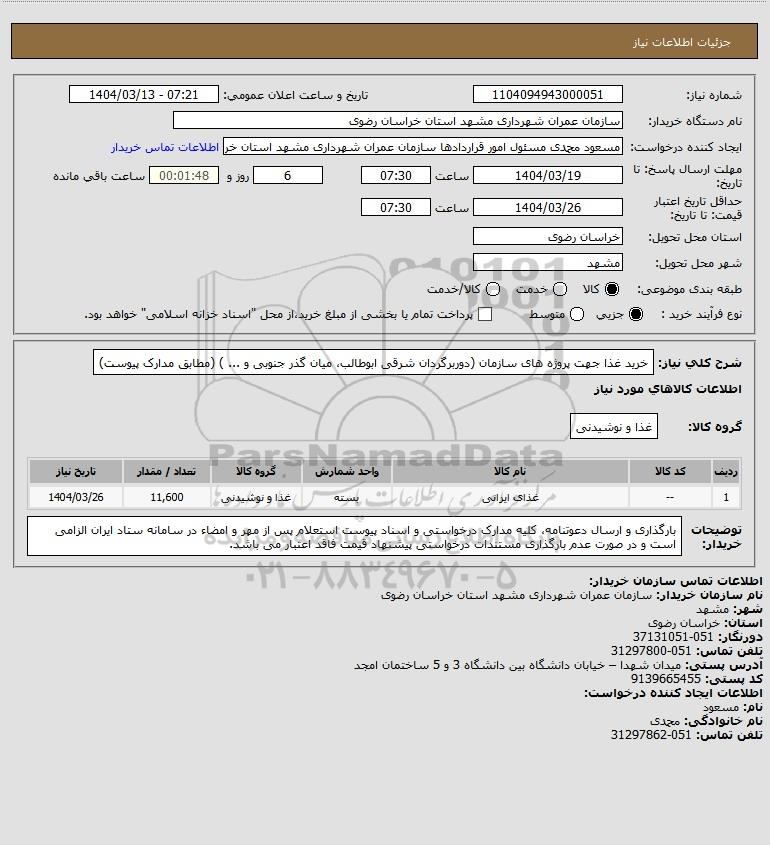 شرح کلی نیاز: خرید غذا جهت پروژه های سازمان (دوربرگردان شرقی ابوطالب، میان گذر جنوبی و ... ) (مطابق مدارک پیوست)