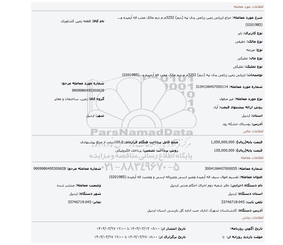 شماره مورد معامله: 3104106407000114 | شماره مورد معامله مرجع: 9909980495300628 | |