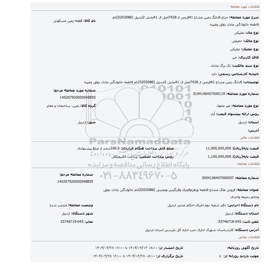 مزایده عمومی مزایده 6دانگ زمین مشاع 41فرعی از 7426اصل ق 41بخش 2اردبیل (0203086)نام فاطمه خانوادگی عادل دولق وغیره برگزار میگردد. از کلیه افراد متخصص و شرکتهای واجد شرایط دعوت به عمل میآید تا در این مزایده با کد خبرگزاری پارس نماد : 9119901 شرکت نمایند تاریخ شروع مزایده : 1404/03/13 مهلت شرکت در مزایده: تا پایان روز 1404/03/28