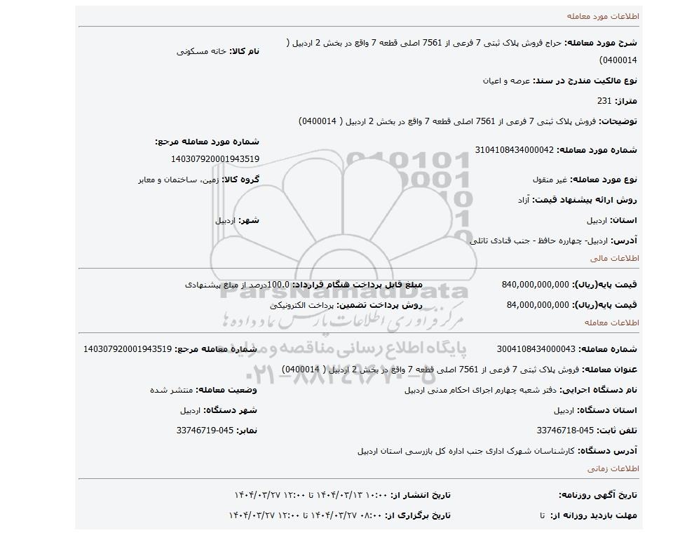 عنوان معامله: فروش پلاک ثبتی 7 فرعی از 7561 اصلی قطعه 7 واقع در بخش 2 اردبیل ( 0400014) | ||