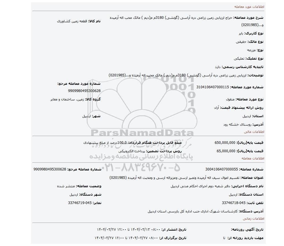 شماره مورد معامله: 3104106407000115 | شماره مورد معامله مرجع: 9909980495300628 | |