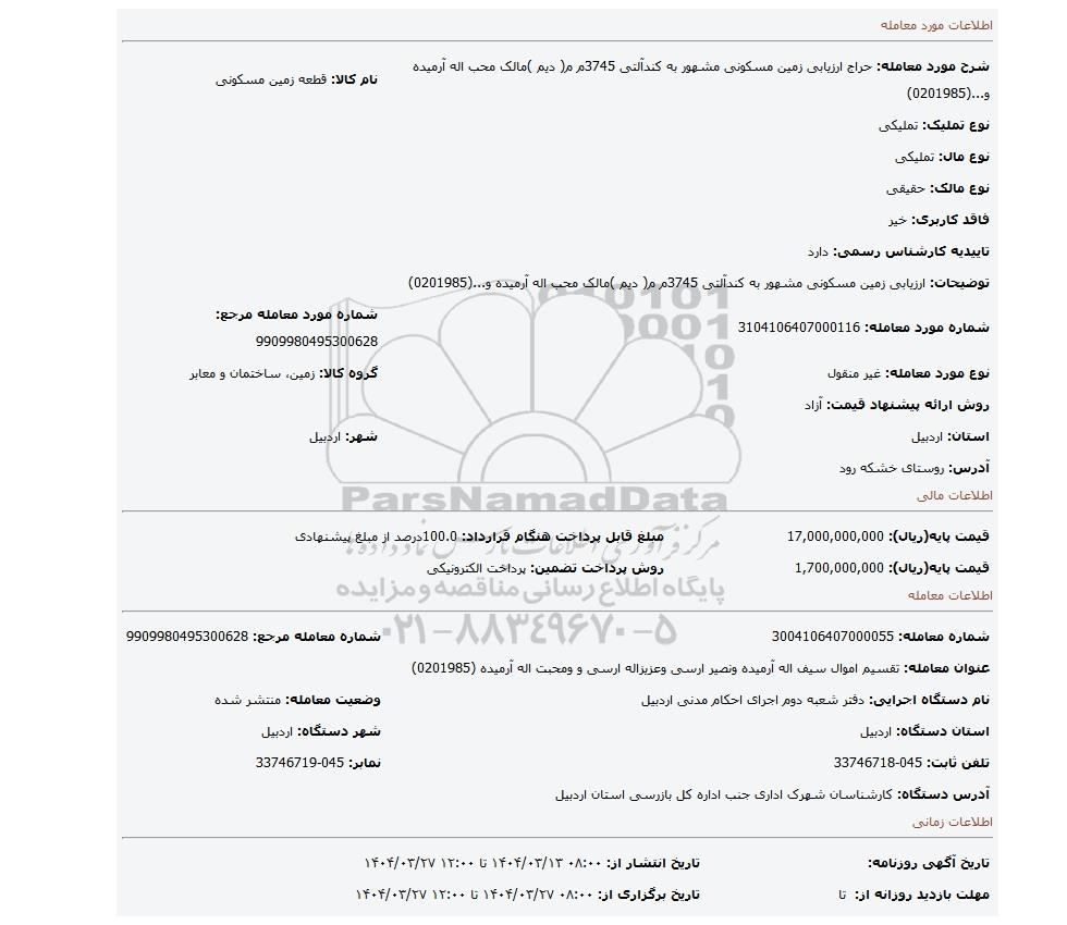 قیمت پایه(ریال): 1,700,000,000 | روش پرداخت تضمین: پرداخت الکترونیکی |