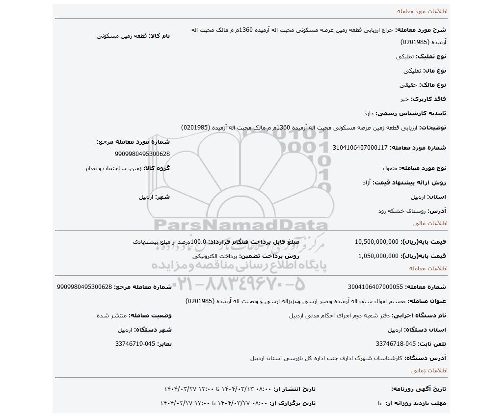 مزایده ارزیابی قطعه زمین عرصه مسکونی محبت اله آرمیده 1360م م مالک محبت اله آرمیده (0201985), مزایده، ارزیابی قطعه زمین عرصه مسکونی محبت اله آرمیده 1360م م مالک محبت اله آرمیده (0201985)