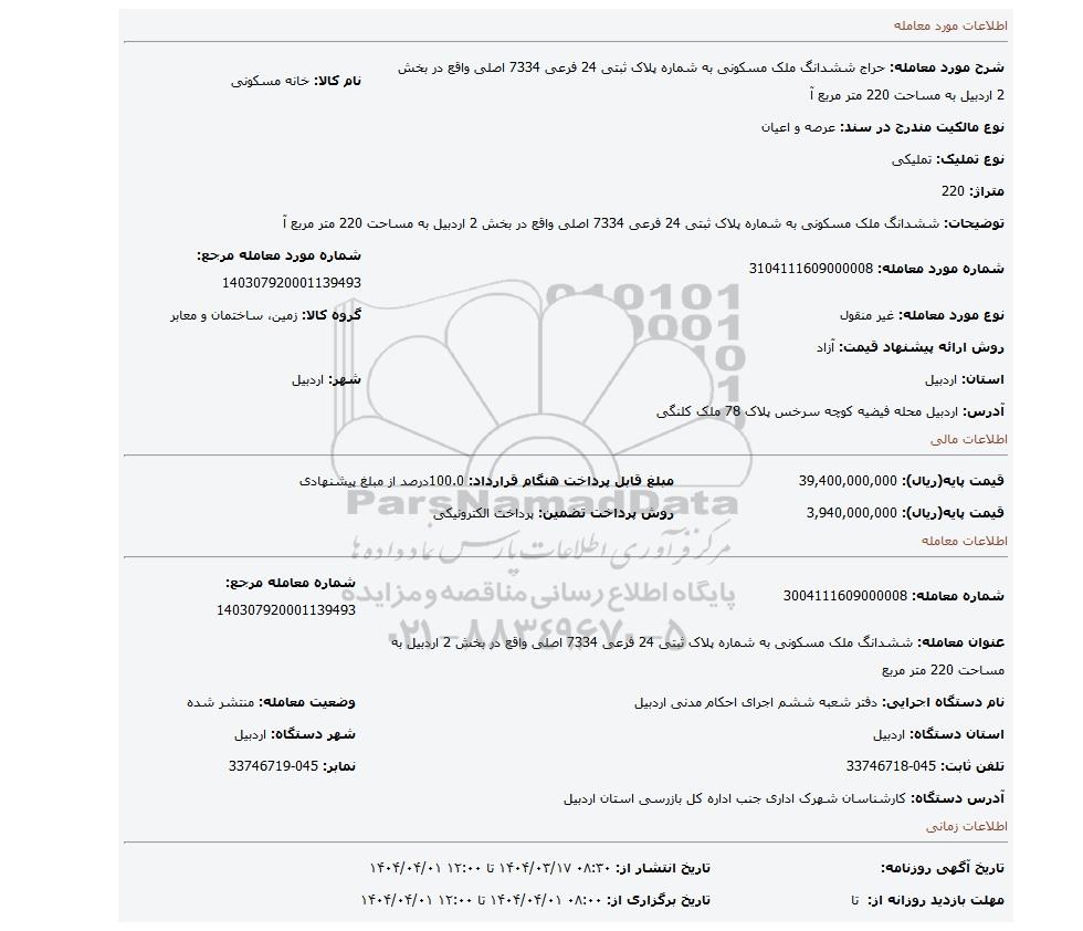 شرح مورد معامله: حراج ششدانگ ملک مسکونی به شماره پلاک ثبتی 24 فرعی 7334 اصلی واقع در بخش 2 اردبیل به مساحت 220 متر مربع آنام کالا: خانه مسکونی
