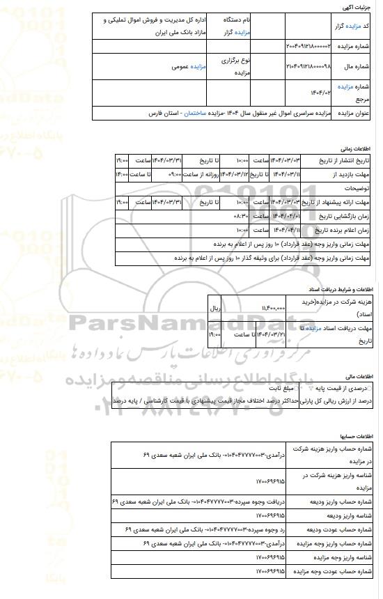 | عنوان مزایده | مزایده سراسری اموال غیر منقول سال 1404 -مزایده ساختمان - استان فارس | |||