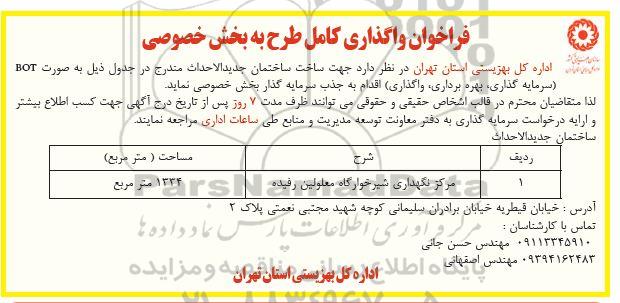 اداره کل بهزیستی استان تهران در نظر دارد جهت ساخت ساختمان جدید الاحداث مندرج در جدول ذیل به صورت BOT (سرمایه گذاری بهره برداری واگذاری) اقدام به جذب سرمایه گذار بخش خصوصی نماید. لذا متقاضیان محترم در قالب اشخاص حقیقی و حقوقی می توانند ظرف مدت 7 روز پس از تاریخ درج آگهی جهت کسب اطلاع بیشتر و ارایه درخواست سرمایه گذاری به دفتر معاونت توسعه مدیریت و منابع طی ساعات اداری مراجعه نمایند.