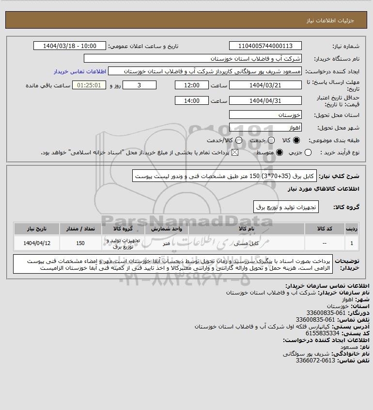 شرح کلی نیاز: کابل برق (35+70*3) 150 متر طبق مشخصات فنی و وندور لیست پیوست