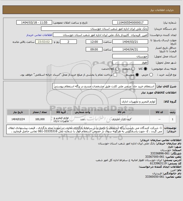 شرح کلی نیاز: استعلام خرید جلد چرمی ملی کارت طبق مشخصات مندرج در برگه استعلام پیوستی
