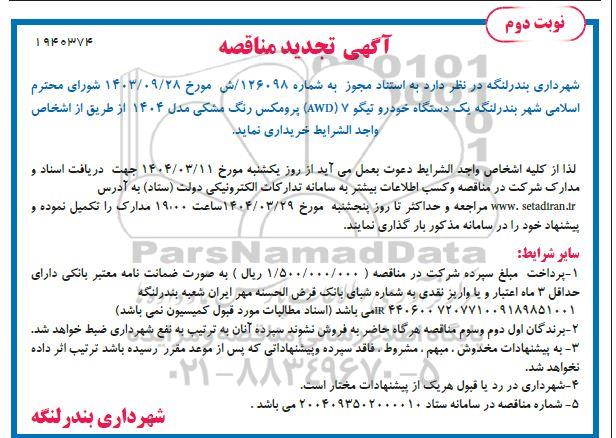 شهرداری بندر لنگه در نظر دارد به استناد مجوز به شماره 126098ش مورخ 1403.09.28 شورای محترم اسلامی شهر بندر لنگه یک دستگاه خودرو تیگو 7 (AWD) پرومکس رنگ مشکی مدل 1404 از طریق از اشخاص واجد الشرایط خریداری نماید. لذا از کلیه اشخاص واجد الشرايط دعوت بعمل می آید از روز یکشنبه مورخ 1404.03.11 جهت دریافت اسناد و مدارک شرکت در مناقصه و کسب اطلاعات بیشتر به سامانه تدارکات الکترونیکی دولت (ستاد) به آدرس سایت ستاد ایران مراجعه و حداکثر تا روز پنجشنبه مورخ 1404.03.29 ساعت 19 مدارک را تکمیل نموده و پیشنهاد خود را در سامانه مذکور بار گذاری نمایند.