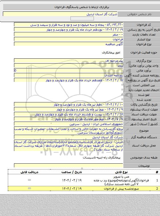 مناقصه پروژه گازرسانی به حفرات خالی و ساخت و نصب انشعابات -تعمیرات شبکه و نصب کنتورورگولاتور درشهرستان سرعین از کلیه افراد متخصص و شرکتها واجد شرایط دعوت به عمل میآید در مناقصه با کد خبرگزاری پارس نماد: 9135934 شرکت نمایند.