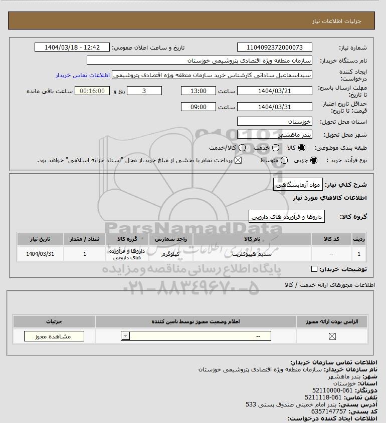 شرح کلی نیاز: مواد آزمایشگاهی