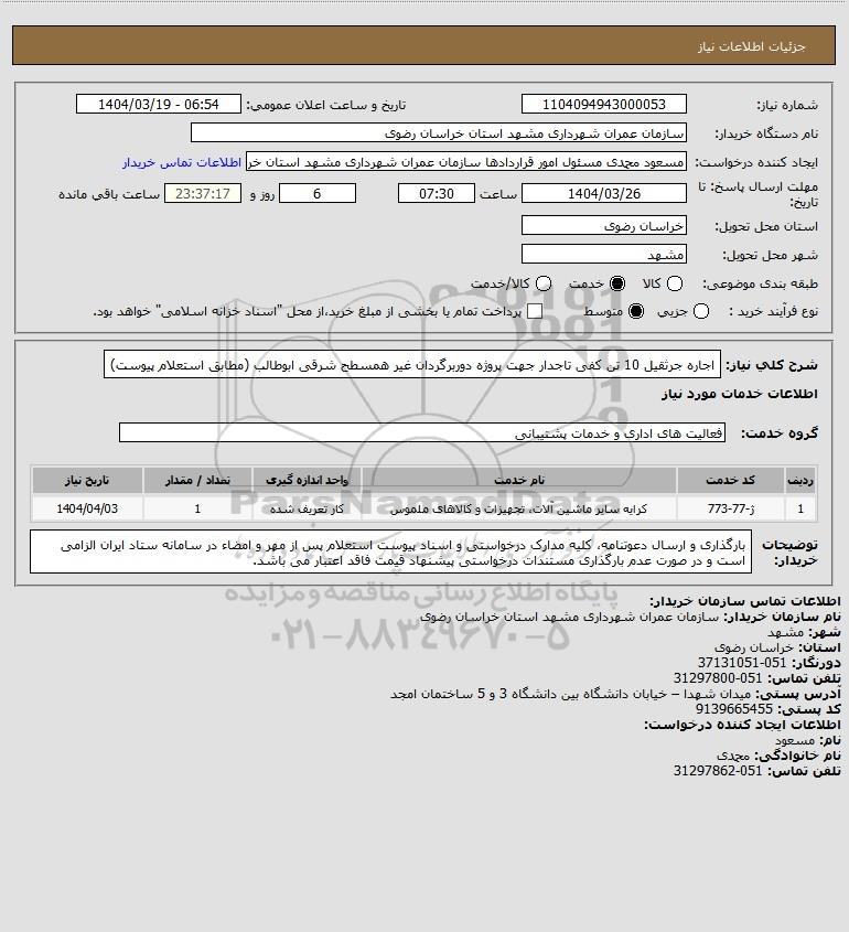 شرح کلی نیاز: اجاره جرثقیل 10 تن کفی تاجدار جهت پروژه دوربرگردان غیر همسطح شرقی ابوطالب (مطابق استعلام پیوست)