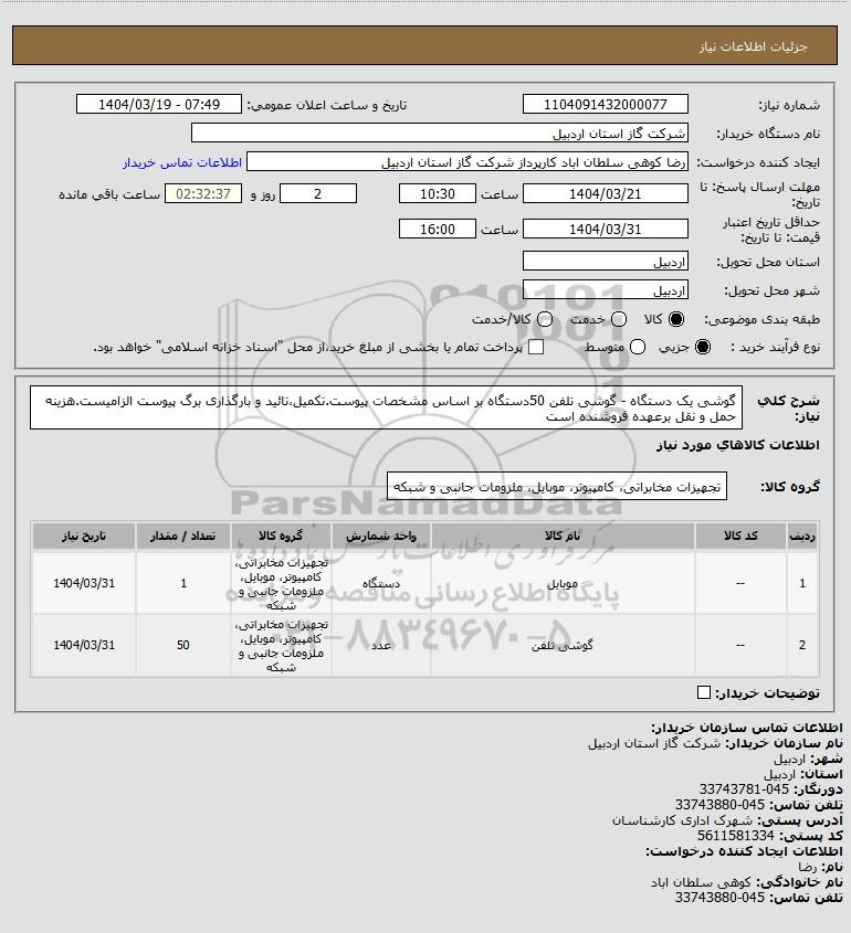 نام دستگاه خریدار:شرکت گاز استان اردبیل