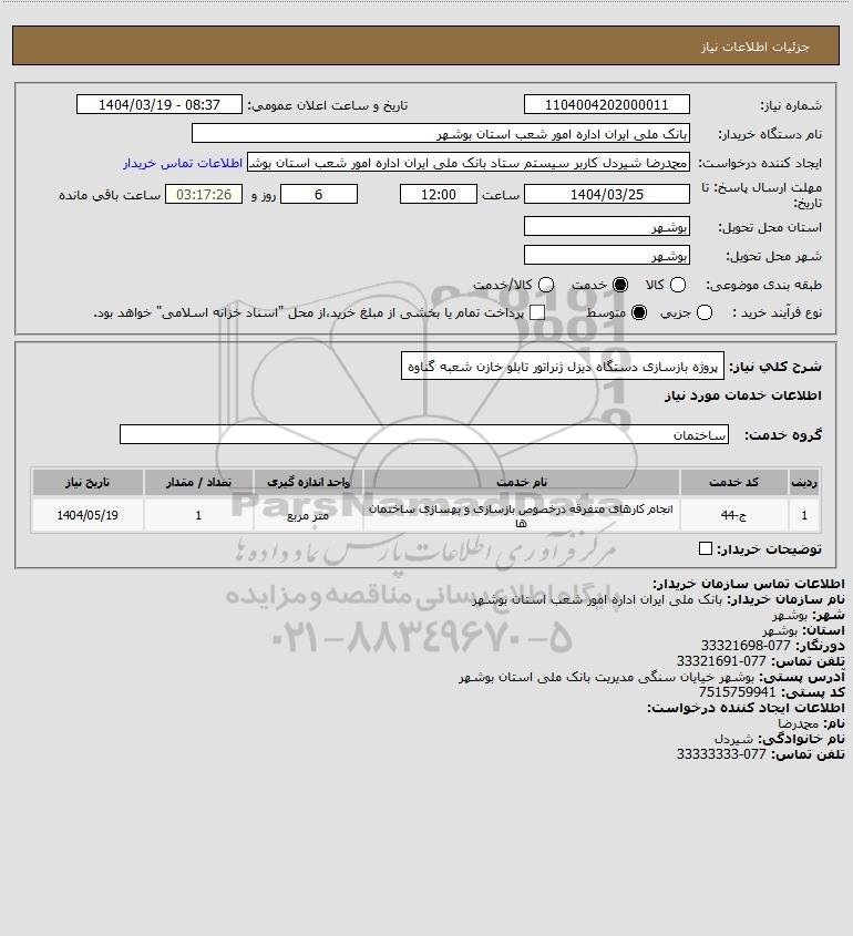 شرح کلی نیاز: پروژه بازسازی دستگاه دیزل ژنراتور تابلو خازن شعبه گناوه