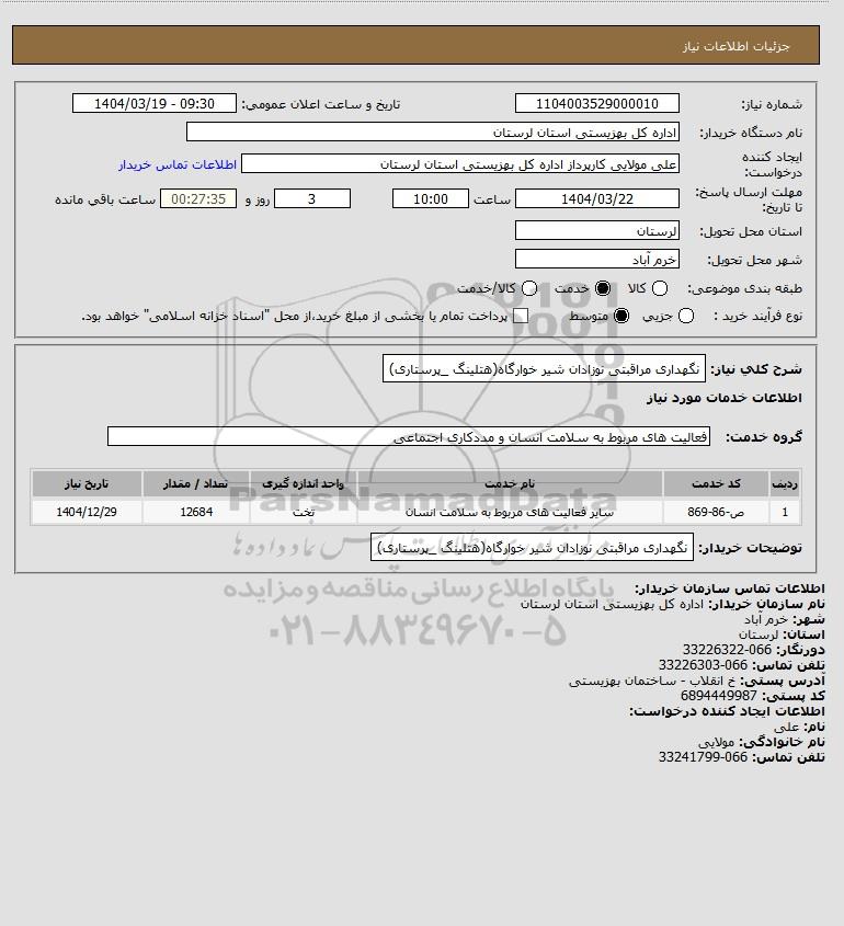 شرح کلی نیاز: نگهداری مراقبتی نوزادان شیر خوارگاه(هتلینگ _پرستاری)