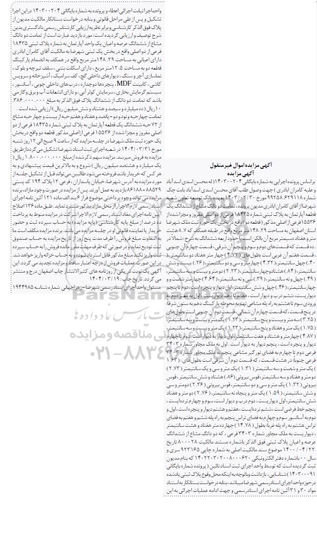 مزایده عمومی مزایده فروش تمامت دو دانگ مشاع از ششدانگ یک قطعه آپارتمان به پلاک ثبتی شماره 18435 فرعی برگزار میگردد. از کلیه افراد متخصص و شرکتهای واجد شرایط دعوت به عمل میآید تا در این مزایده با کد خبرگزاری پارس نماد : 9142021 شرکت نمایند تاریخ شروع مزایده : 1404/03/19 مهلت شرکت در مزایده: تا پایان روز 1404/03/31 مکان برگزاری اموال واگذاری استانهای اصفهان و دستهبندیهای مربوط به این حراجی املاک و زمین میباشد.
