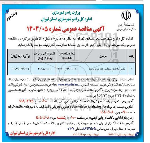اداره کل راه و شهرسازی استان تهران در نظر دارد پروژه ذیل را از طریق برگزاری مناقصه عمومی یک مرحله ای با ارزیابی کیفی از طریق سامانه تدارکات الکترونیک دولت واگذار نماید.
