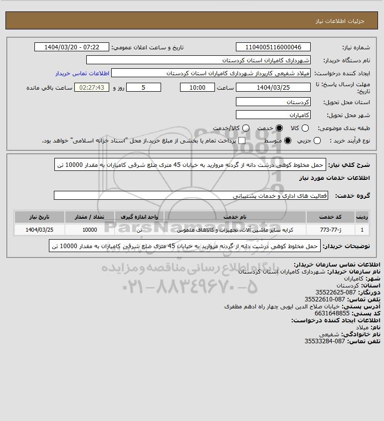 شرح کلی نیاز: حمل مخلوط کوهی درشت دانه از گردنه مروارید به خیابان 45 متری ضلع شرقی کامیاران به مقدار 10000 تن