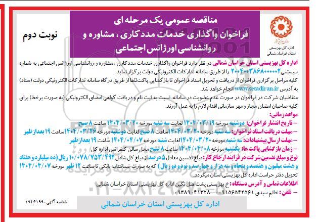 اداره کل بهزیستی خراسان شمالی در نظر دارد فراخوان واگذاری خدمات مددکاری، مشاوره و روانشناسی اورژانس اجتماعی به شماره 2004003868000002 را از طریق سامانه تدارکات الکترونیکی دولت برگزار نماید.