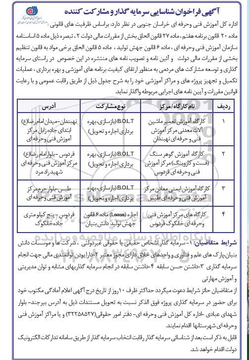 از متقاضیان حائز شرایط دعوت میگردد حداکثر ظرف 10 روز از تاریخ درج آگهی اعلام آمادگی مکتوب خود برای حضور در سرمایه گذاری پروژه فوق الذکر نسبت به تحویل مستندات ذیل به آدرس بیرجند- بلوار شهدای عبادی اداره کل آموزش فنی و حرفه ای دفتر امور حقوقی (32258527) و یا مراکز آموزش فنی و حرفه ای شهرستانها اقدام نمایند.