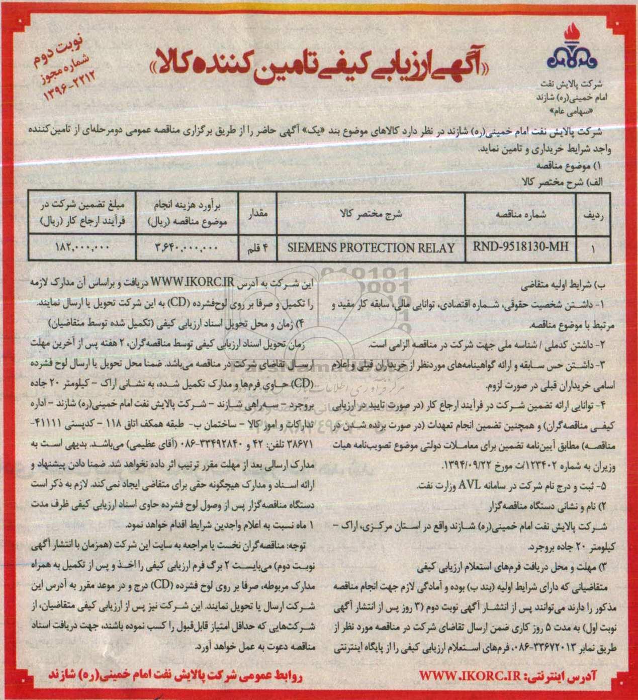 ارزیابی کیفی SIEMENS PROTECTION RELAY نوبت دوم از کلیه افراد متخصص و شرکتها واجد شرایط دعوت به عمل میآید در مناقصه با کد خبرگزاری پارس نماد: 914960 شرکت نمایند.