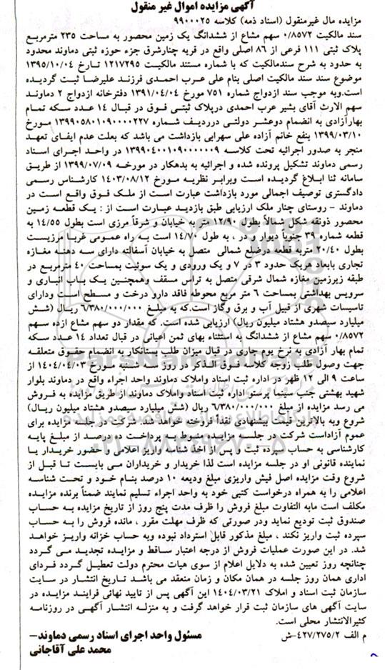 آگهی مزایده اموال غیرمنقول