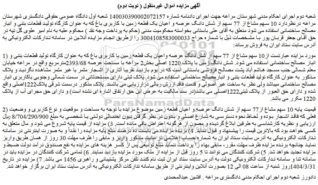شعبه دوم اجرای احکام مدنی شهرستان مراغه جهت اجرای دادنامه شماره 140030390002072157 شعبه اول دادگاه عمومی حقوقی دادگستری شهرستان مراغه درنظردارد 10 سهم مشاع از 77 سهم از شش دانگ عرصه و اعیان یک قطعه زمین با کاربری باغ که به عنوان کارگاه تولید قطعات بتنی و انبار مصالح ساختمانی استفاده می شود متعلق به آقای علی باستانی بخواسته محکومیت مدنی (حکم به پرداخت وجه نقد ) محکوم علیه به نام امیر علوی گل تپه در حق آقای جعفر قربان پور با مشخصات ذیل با شماره حراج 3004108583000033 را ازطریق انجام مزایده آنلاین در سامانه تدارکات الکترونیکی به آدرس سایت ستاد ایران به فروش برساند: