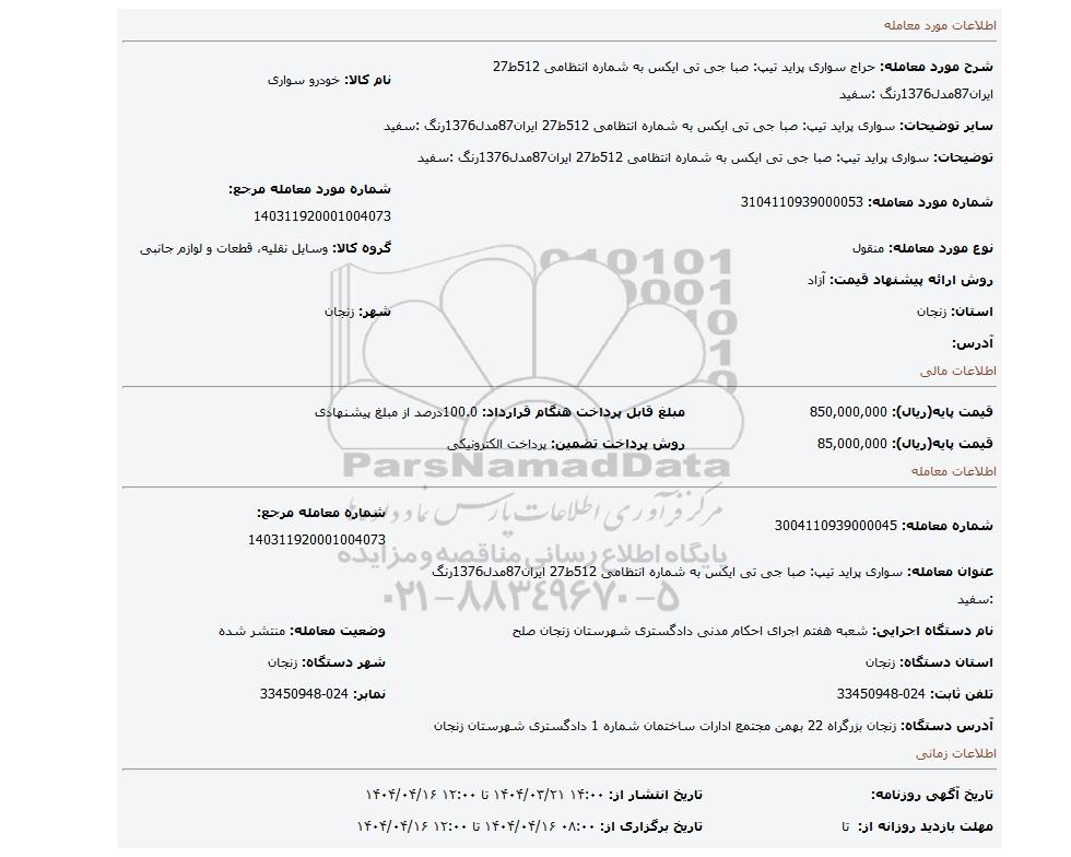 | نوع مورد معامله: منقول | گروه کالا: وسایل نقلیه، قطعات و لوازم جانبی | |
