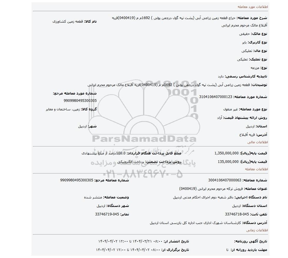 مزایده قطعه زمین زراعی آبی (پشت تپه گول درچمن یولی ) 1692م م (0400419)قریه آقبلاغ مالک مرحوم محرم ایرانی, مزایده، قطعه زمین زراعی آبی (پشت تپه گول درچمن یولی ) 1692م م (0400419)قریه آقبلاغ مالک مرحوم محرم ایرانی