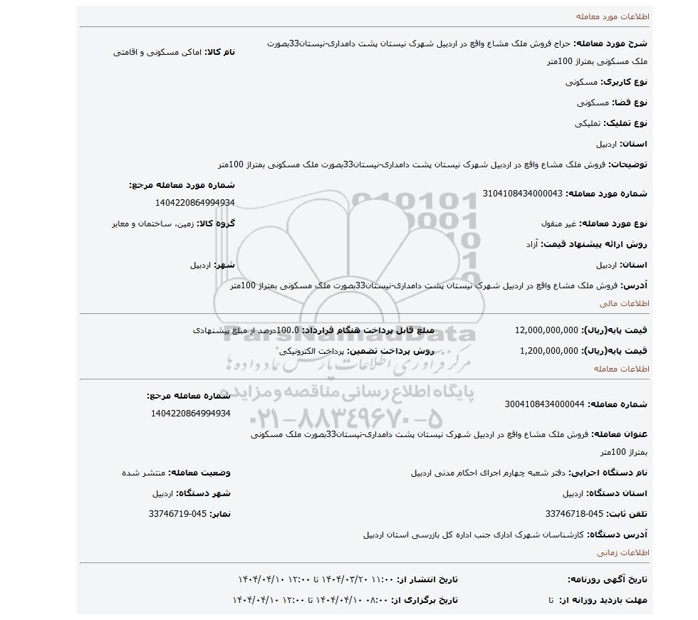 شرح مورد معامله: حراج فروش ملک مشاع واقع در اردبیل شهرک نیستان پشت دامداری-نیستان33بصورت ملک مسکونی بمتراژ 100متر | نام کالا: اماکن مسکونی و اقامتی | |