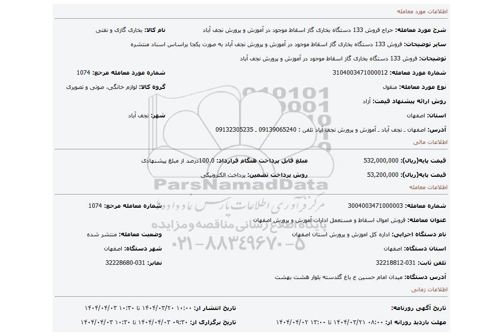 مزایده، فروش 133 دستگاه بخاری گاز اسقاط موجود در آموزش و پرورش نجف آباد